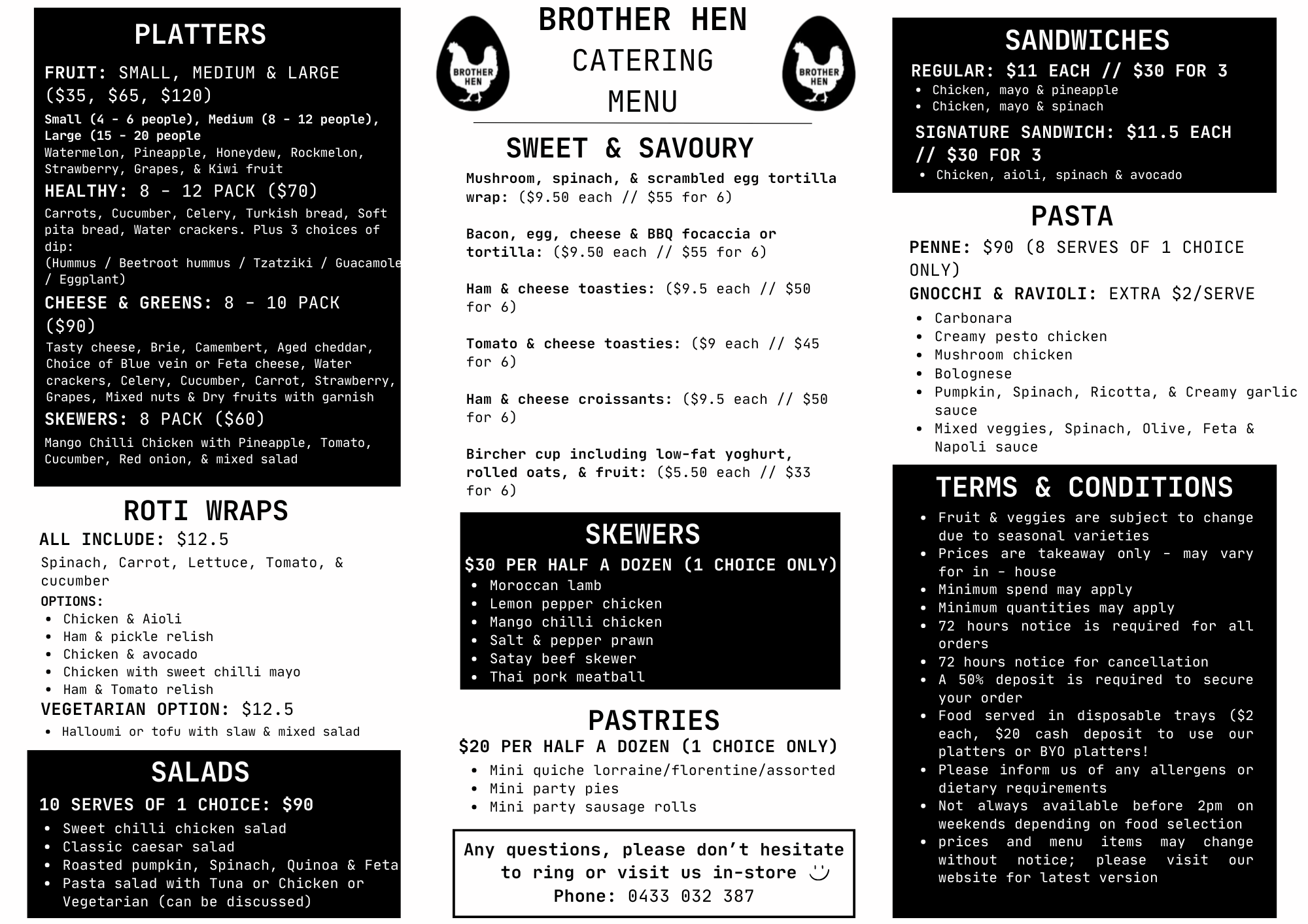 Please find our catering Menu below and email us with your details so that we will respond with a quote. Our email address is brotherhencafes@gmail.com